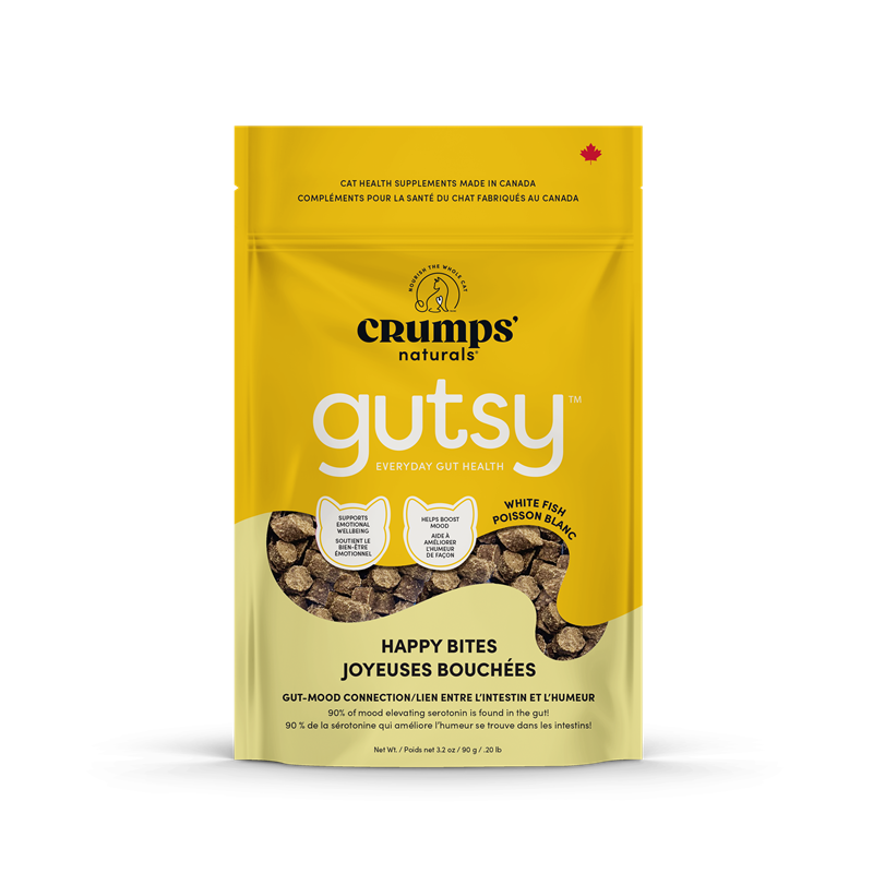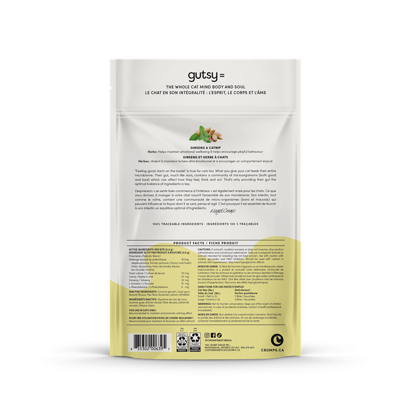 Active ingredients: Proprietary Blend of Prebiotics (Apple pomace, Tomato Pomace, Chicory Root/Inulin), Yeast culture, Catnip, Ginseng, L-Tyrosine, L-Phenylalanine Inactive ingredients: Coconut glycerin, Guar gum, Natural flavour, Pea fibre, Rosemary extract, Whitefish