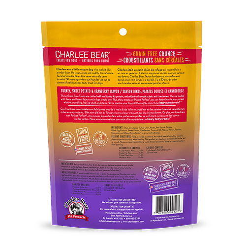 THESE GRAIN FREE Treats are crafted with real turkey for protein, antioxidant-rich sweet potato and cranberries right here in the USA. Made without wheat, corn, soy or artificial preservatives, they’re loaded with flavor and have a light crunch dogs simply love. Plus, these treats are Pocket Perfect®, which means you can keep them in your pocket without crumbling, leaving smells or stains. So they’re great for training or just for fun. We’re positive your dog will thoroughly enjoy these beary tasty treats!™