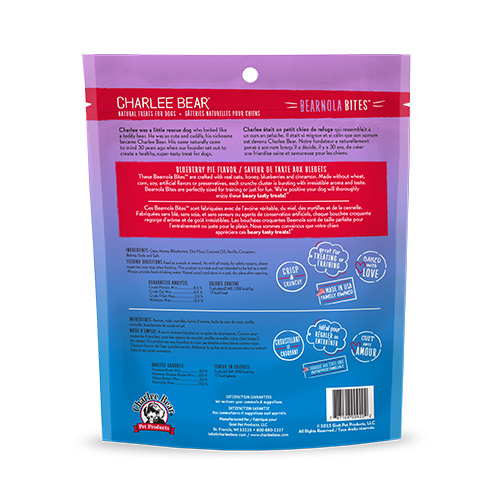 THESE BEARNOLA™ BITES are crafted with real oats, honey, blueberries and cinnamon right here in the USA. Made without wheat, corn, soy, artificial flavors or preservatives, each crunchy cluster is bursting with irresistible aroma and taste. Bearnola™ Bites are everything they’re baked up to be, and perfectly sized for training or just for fun. We’re positive your dog will thoroughly enjoy these beary tasty treats!™