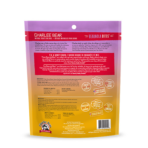 THESE BEARNOLA™ BITES are crafted with real oats, honey, blueberries and cinnamon right here in the USA. Made without wheat, corn, soy, artificial flavors or preservatives, each crunchy cluster is bursting with irresistible aroma and taste. Bearnola™ Bites are everything they’re baked up to be, and perfectly sized for training or just for fun. We’re positive your dog will thoroughly enjoy these beary tasty treats!™