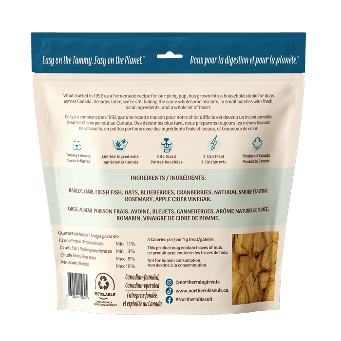 Smoked Fish: Barley, Trout, Pickerel, Salmon, Oats, Blueberries, Natural Smoke Flavour, Rosemary, Apple Cider Vinegar.