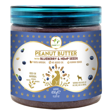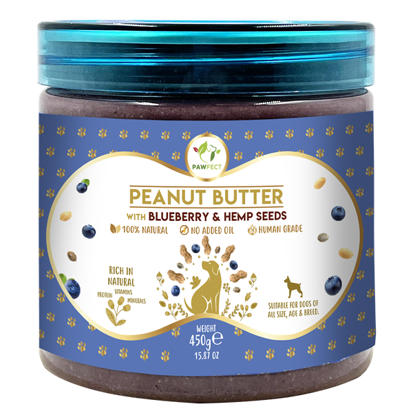 Naturally thick and creamy, it's deliciously nutritious treat on its own or for dog licking mats, enrichment toys or even disguising medications. Can also be added to food as a great source of protein, heart healthy fats, vitamin B & E. Ingredients: Peanuts, Blueberry & Hemp seeds Benefits: * Blueberries a known powerhouse of vitamins and minerals that support healthy skin, bone, brain health. Hemp seeds that reduce inflammation and skin irritations/ associated pain. Great source of protein, B and E vitamins. Specially crafted for pooches with no Xylitol or added salt, sugar, oil or preservatives.
