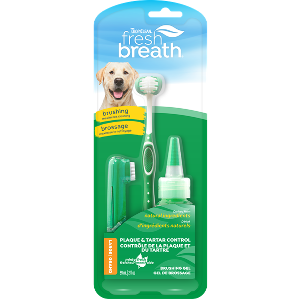 Oral care is a critical part of a dog’s overall health, making it an important responsibility of pet ownership. Even with routine professional cleanings, pets still need regular teeth brushing at home. The Fresh Breath Oral Care Kit for Large Dogs provides everything you need to establish a consistent oral care routine for your pet. The kit includes a Fresh Breath TripleFlex™ Toothbrush, Gentle Finger Brush, and Brushing Gel. When used regularly, you can provide your pet with top-notch dental care, right at home.