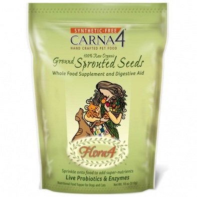 Our amazing Flora4 Ground Sprouted Seeds Food Topper simplifies the chore of learning how to supplement effectively to add the live probiotics, plant enzymes, phytonutrients and whole food vitamins & minerals that are lacking in an all-meat diet. Flora4 contains only 100% raw organic sprouted seeds (a blend of barley seed, flaxseed, and lentils), ground into a fine powder and packaged in daily servings.