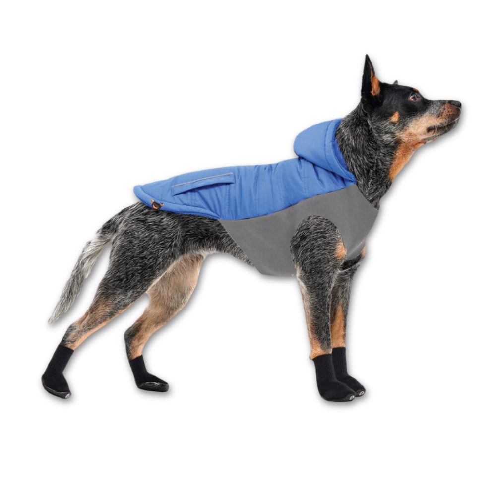 Even in the most extreme weather, the Goo-eez Hooded Signature Winter Jacket will keep your dog warm and cozy. Superior insulation is provided by the water-resistant shell and plush interior lining. Our proprietary elastomer gel and specially weaved rib fabric underbelly ensure a tight fit that keeps warm air in and cold air out. The flexible underbelly is waterproof, can stretch up to 2 x making it super easy to put on and take off, and does not irritate the skin.