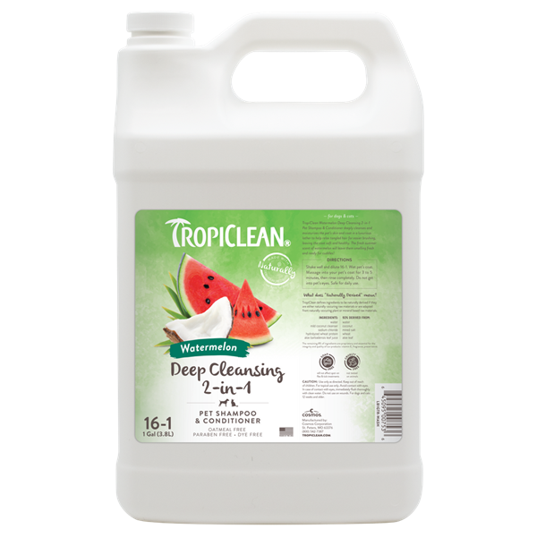 Tropiclean Watermelon Deep Cleansing 2-in-1 Pet Shampoo & Conditioner deeply cleanses and moisturizes the pet's skin and coat in a luxurious lather to help relax tangled hair for easier brushing, leaving the coat soft and healthy. The fresh summer scent of watermelon will leave them smelling fresh.