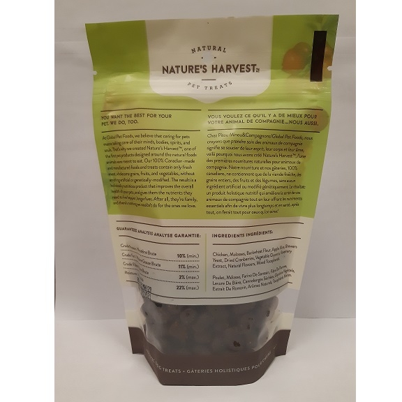 Chicken, molasses, buckwheat flour, apple fiber, brewers yeast, dried cranberries, vegetable glycerin, rosemary extract, natural flavours, mixed tocopherols