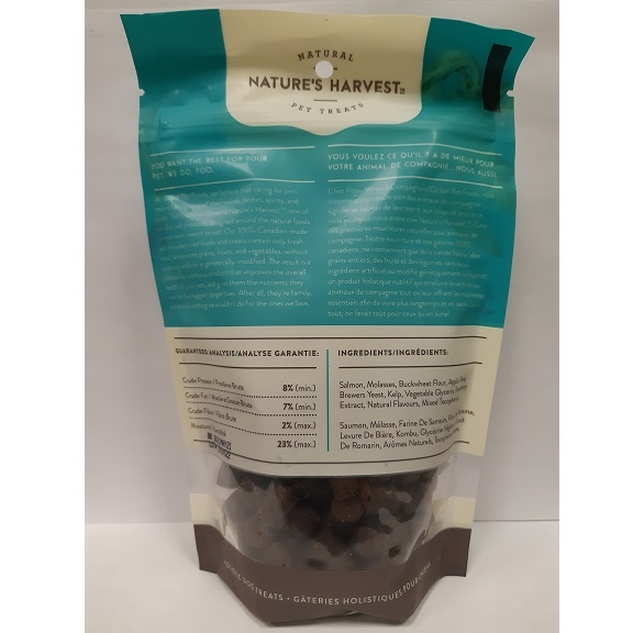 Salmon, molasses, buckwheat flour, apple fiber, brewers yeast, kelp, vegetable glycerin,rosemary extract, natural flavours, mixed tocopherols