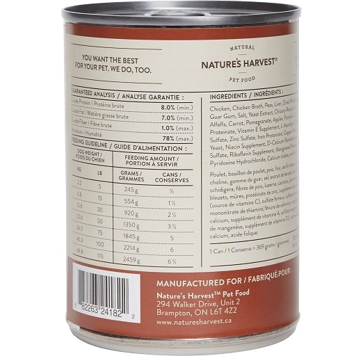 Chicken, Chicken Broth, Peas, Liver, Dried Whole Eggs, Tricalcium Phosphate, Choline Chloride, Guar Gum, Salt, Yeast Extract, Chicory Roots Extract, Yucca Schidigera Extract, Pea Fiber, Alfalfa, Carrot, Pomegranate, Apples, Pumpkin, Cranberries, Blueberries, Blackberries, Zinc Proteinate, Vitamin E Supplement, L-Ascorbyl-2-Polyphosphate (Source of Vitamin C), Ferrous Sulfate, Zinc Sulfate, Iron Proteinate, Copper Proteinate, Thiamine Mononitrate, Selenium Yeast, Niacin Supplement, D-Calcium Pantothenate, Vitamin A Supplement, Manganese Sulfate, Riboflavin Supplement, Manganese Proteinate, Vitamin D3 Supplement, Vitamin B12, Pyridoxine Hydrochloride, Calcium Iodate, and Folic Acid.