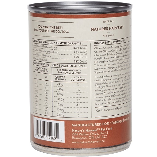 Chicken, Chicken Broth, Peas, Liver, Dried Whole Eggs, Tricalcium Phosphate, Flaxseed, Sundried Alfalfa, Choline Chloride, Guar Gum, Salt, Yeast Extract, Glucosamine Hydrochloride, Chicory Roots Extract, Chondroitin Sulfate, L-Carnitine, Yucca Schidigera Extract, Pea Fiber, Carrot, Pomegranate, Apples, Pumpkin, Cranberries, Blueberries, Blackberries, Zinc Proteinate, Vitamin E Supplement, L-Ascorbyl-2-Polyphosphate (Source of Vitamin C), Ferrous Sulfate, Zinc Sulfate, Iron Proteinate, Copper Proteinate, Thiamine Mononitrate, Selenium Yeast, Niacin Supplement, D-Calcium Pantothenate, Vitamin A Supplement, Manganese Sulfate, Riboflavin Supplement, Manganese Proteinate, Vitamin D3 Supplement, Vitamin B12, Pyridoxine Hydrochloride, Calcium Iodate, and Folic Acid