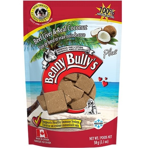 Benny Bully Liver Plus Coconut provides a diet high in fiber from the shedded coconut meat which can reduce the risk of treat constipation. Both the coconuts’ meat and oils provide a beneficial source of fat that help maintain a healthy blood pressure, improve a dog’s skin and coat, aid in digestion, and control allergic reactions. Coconuts provide a fresh natural flavour which enhances the taste of the beef liver!