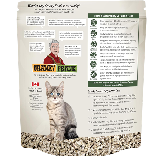 - From Farm to Litter Box, CrankyFrank hemp products are grown and manufactured in Manitoba, Canada