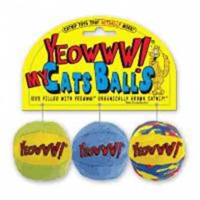 Yes, you read it correctly. Three Yeowww! organic catnip filled balls on one header card are sure to be a hit. My Cats Balls will send kitty to new heights of pleasure the minute they start to fondle them. Each ball is 2” in diameter and full of nip.