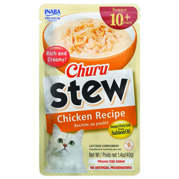Inaba Churu for Senior 10+ Chicken Stew Lickable Cat Treats are made with real chicken for a drool-worthy delight. Plus, they’re made without grains, preservatives, or artificial colors—just like Churu, their favorite lickable cat treats. Churu Stew for seniors is a rich, broth-based gelée with a thicker consistency, perfect to serve as a side dish. And there are added shreds of real chicken for extra texture. Not just a tasty treat—it’s a health booster. This recipe is enriched with omega-3 fatty acids, a key nutrient for brain and cognitive function in senior kitties. And, it’s packed with vitamin C and E to strengthen your furbaby’s immune system. Top their meal with a luscious treat that tastes great and is healthy and hydrating. Each pouch has 89% moisture and only twenty-one calories, so you can feel confident about using it to top your kitty’s kibble. These pouches are designed for convenience, making them a perfect side dish or complement to your purring pal’s meal.