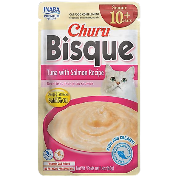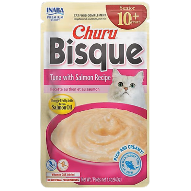 Inaba Churu for Senior 10+ Tuna & Salmon Bisque Lickable Cat Treats is crafted with real chicken, and it’s completely free from grains, preservatives, or artificial colors. This rich and creamy purée has a thicker consistency, making it ideal for serving as a delightful side dish or for sneaking in medication. It’s also enriched with omega-3 fatty acids, an essential nutrient to support brain and cognitive function in senior kitties. On top of that, it’s loaded with vitamin C and E to help strengthen their immune system. And rest assured, this recipe is made without grains, preservatives, and artificial colors. Treat your furry friend to a luscious addition to their meal that’s both tasty and nourishing. Each pouch contains 90% moisture and just twenty calories, allowing you to feel great about enhancing your kitty’s bowl of regular dry cat food. These pouches are designed with your convenience in mind, making them the perfect complement to your beloved purring pal’s meals, even on the busiest of days.