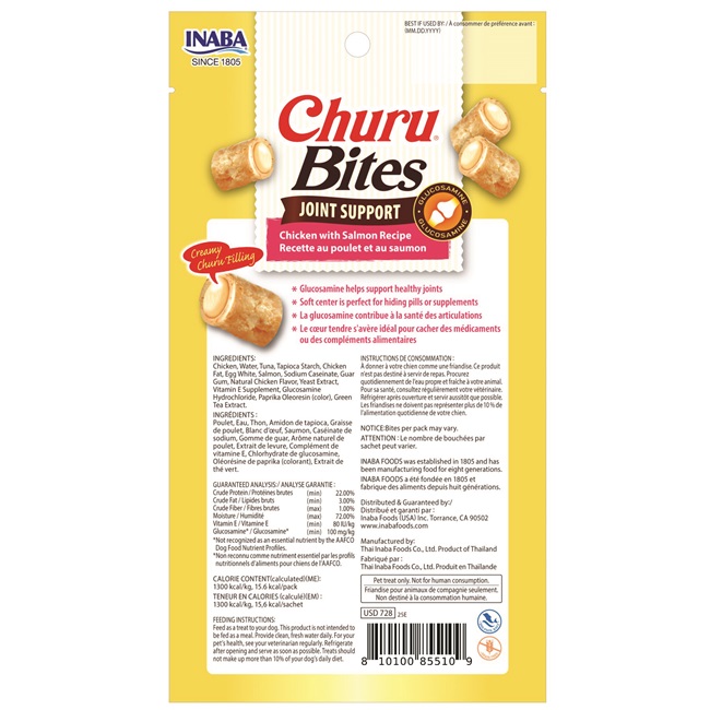 Inaba Churu Bites Joint Support Chicken with Salmon Recipe Dog Treats are made from premium, high-quality ingredients, like real chicken, and salmon. These delicious and functional bite-sized treats are packed with Glucosamine to support your dog's joint health, Vitamin E for their immune system, and Green Tea Extract, an antioxidant. Each soft, pillow-shaped bite combines two irresistible textures: a savoury baked chicken outer layer and a creamy Churu puree center that dogs love. Plus, they are grain-free, preservative-free, and free from artificial colours. These tubes are perfect to pack for training sessions or walks at the park, or to use as a way to hide their pills or supplements. Treat your pup with the perfect blend of taste, texture, and joint-supporting goodness with Inaba Churu Bites for Dogs.