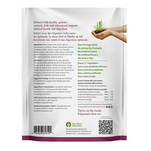 Pet Greens Li'l Treats Beef Recipe Dog Treats are full of flavour and are naturally pure, nutritious greens! These little bite-size treats are perfect for small dogs, puppies, training and contain no wheat gluten, corn, soy, or artificial colours or flavours. The added nutritional benefits of wheatgrass, kale and spinach support your pet's overall health in this tiny, mighty training treat!